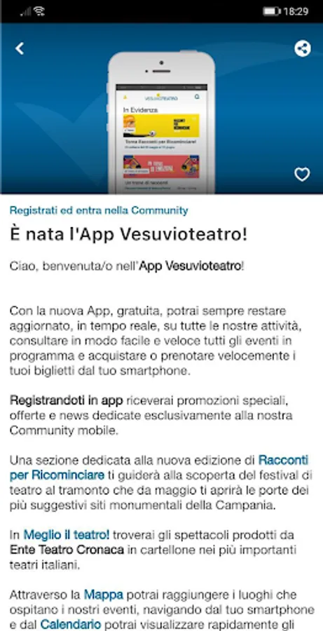 Since 1996 we have been organizing cultural projects, theater and music festivals and artistic events in Campania, Italy. With the free Vesuvioteatro App, we want to offer you a new engaging experience: you can now receive news and alerts about the upcoming events and you can easily book your tickets from your smartphone.
