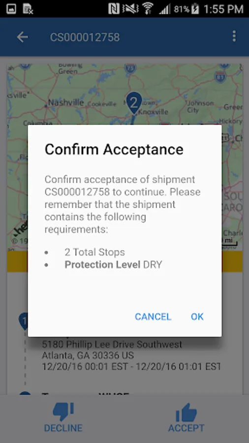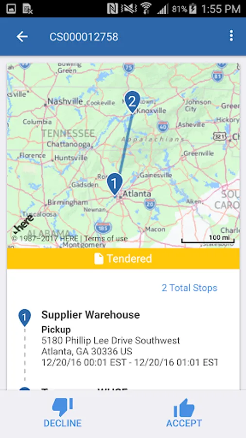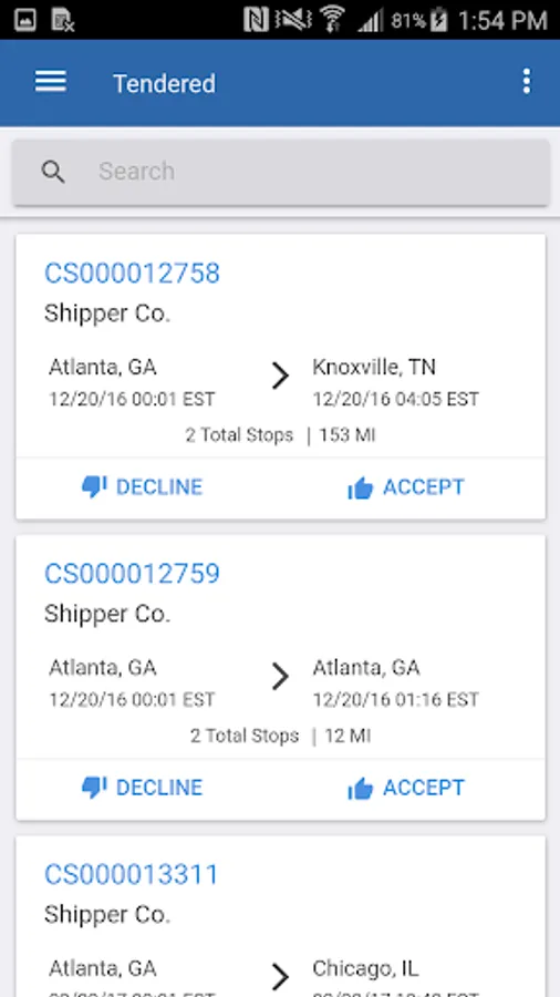 • View details about tendered shipments including number of stops, distance, hazardous status and required equipment.