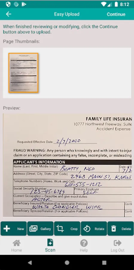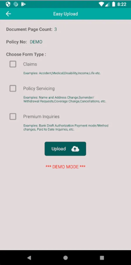 Make the chore of uploading important insurance documents easier by running this app. Point your device's camera at a document and the app will automatically crop an image of the document and prepare it for upload. Then choose the type of document you are sending and press the "Upload" button - and you are done!
