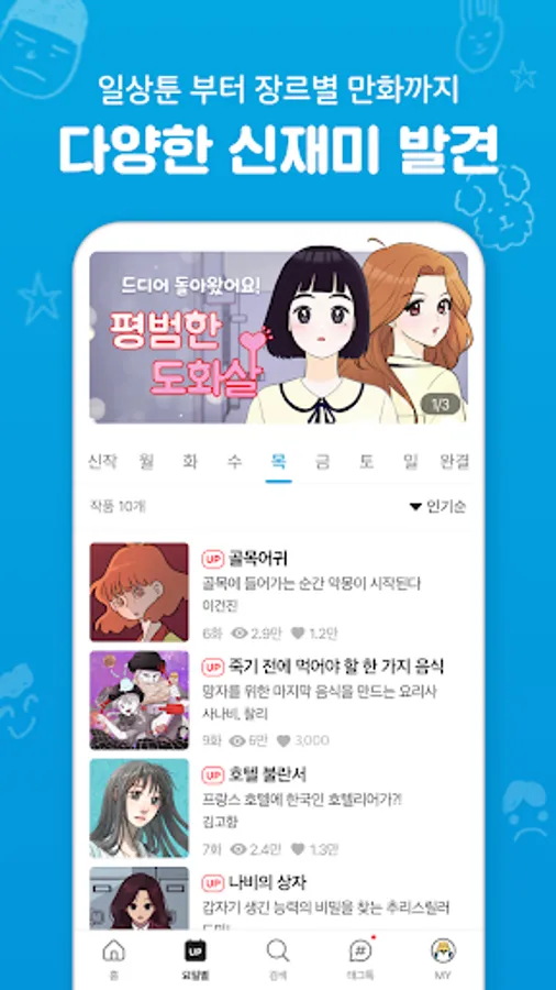 Enjoy comfortable webtoons of various genres that are published weekly or biweekly until the end.