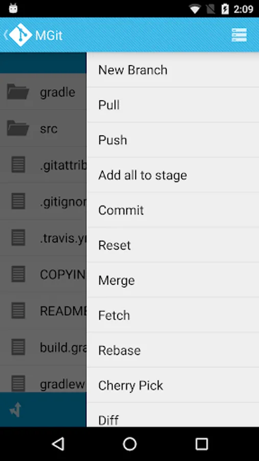 MGit is a full featured Git client that allows you to manage files in a local Git repository, clone, push and pull to and from remote repositories. It allows you to browse files in your local repositories, see diffs of changed files, stage and commit files all in your local repository while offline.