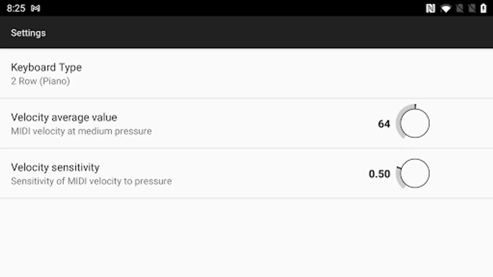 * scroll-able, 6 octave onscreen keyboard, selectable for 1 or 2 row display