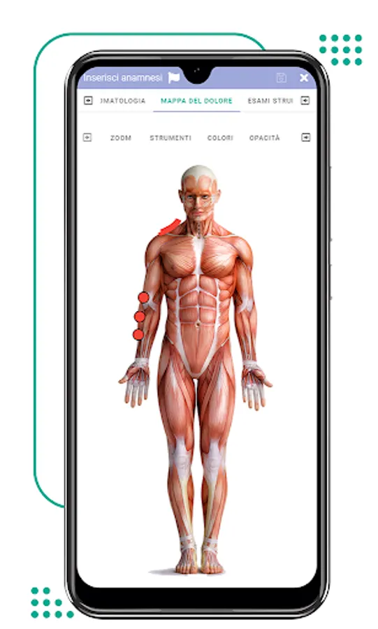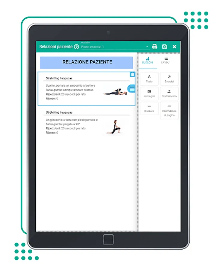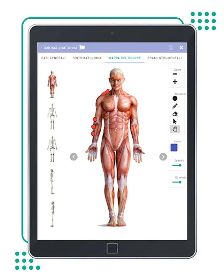In addition to this it is possible to record treatment cards, anamnesis and clinical tests fully customizable and create reports / exercise plans to send to the patient.