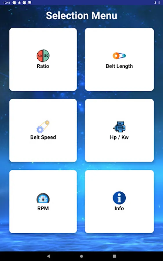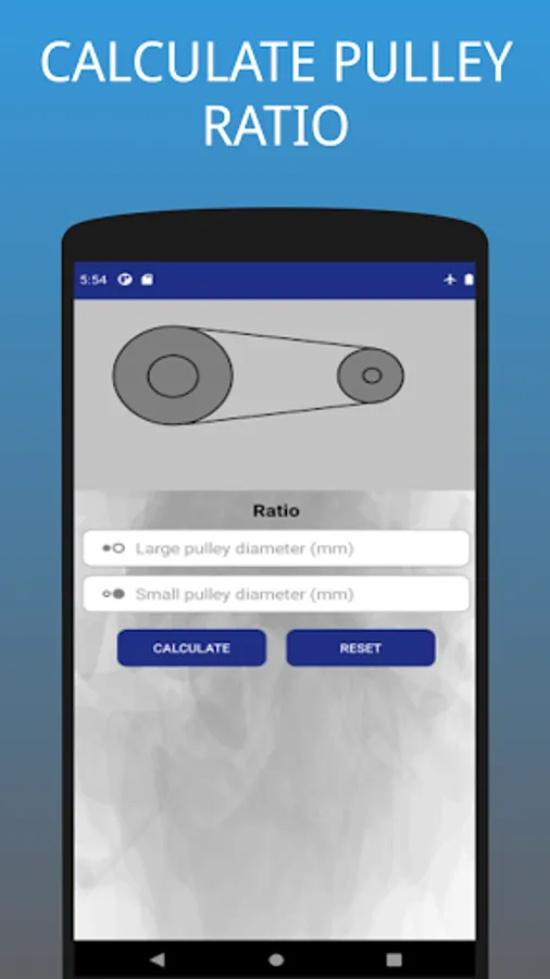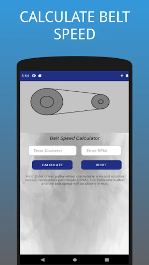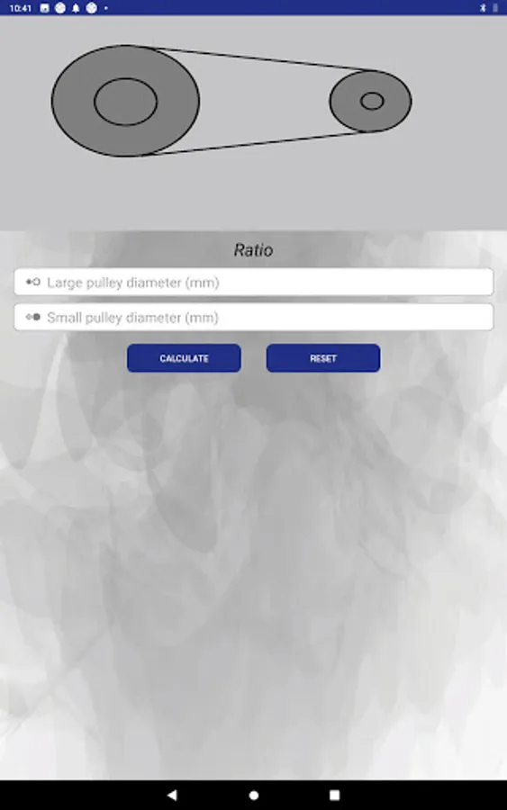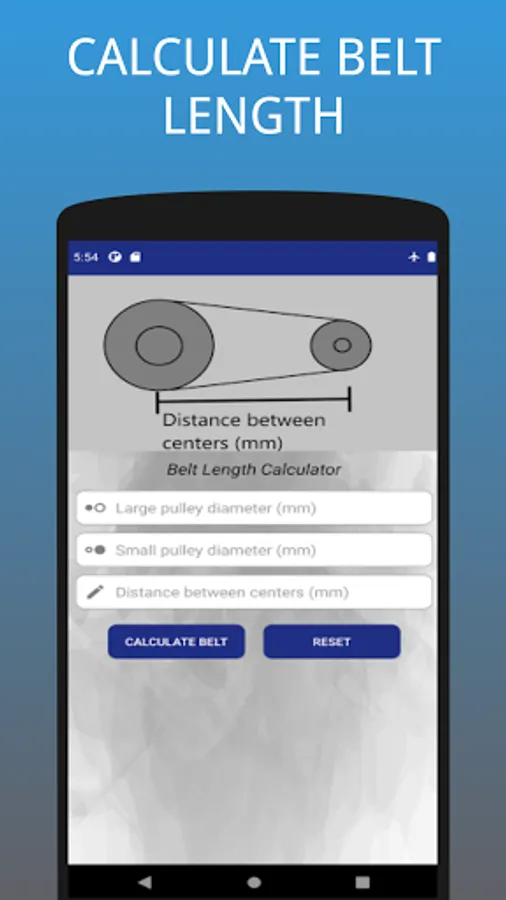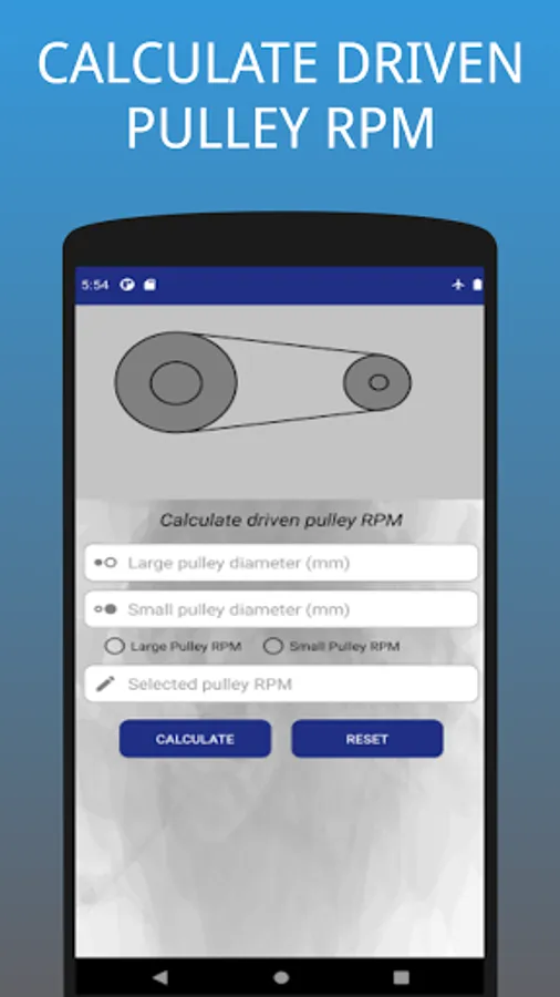 This pulley calculator analyzes a system of two pulleys joined by a belt.