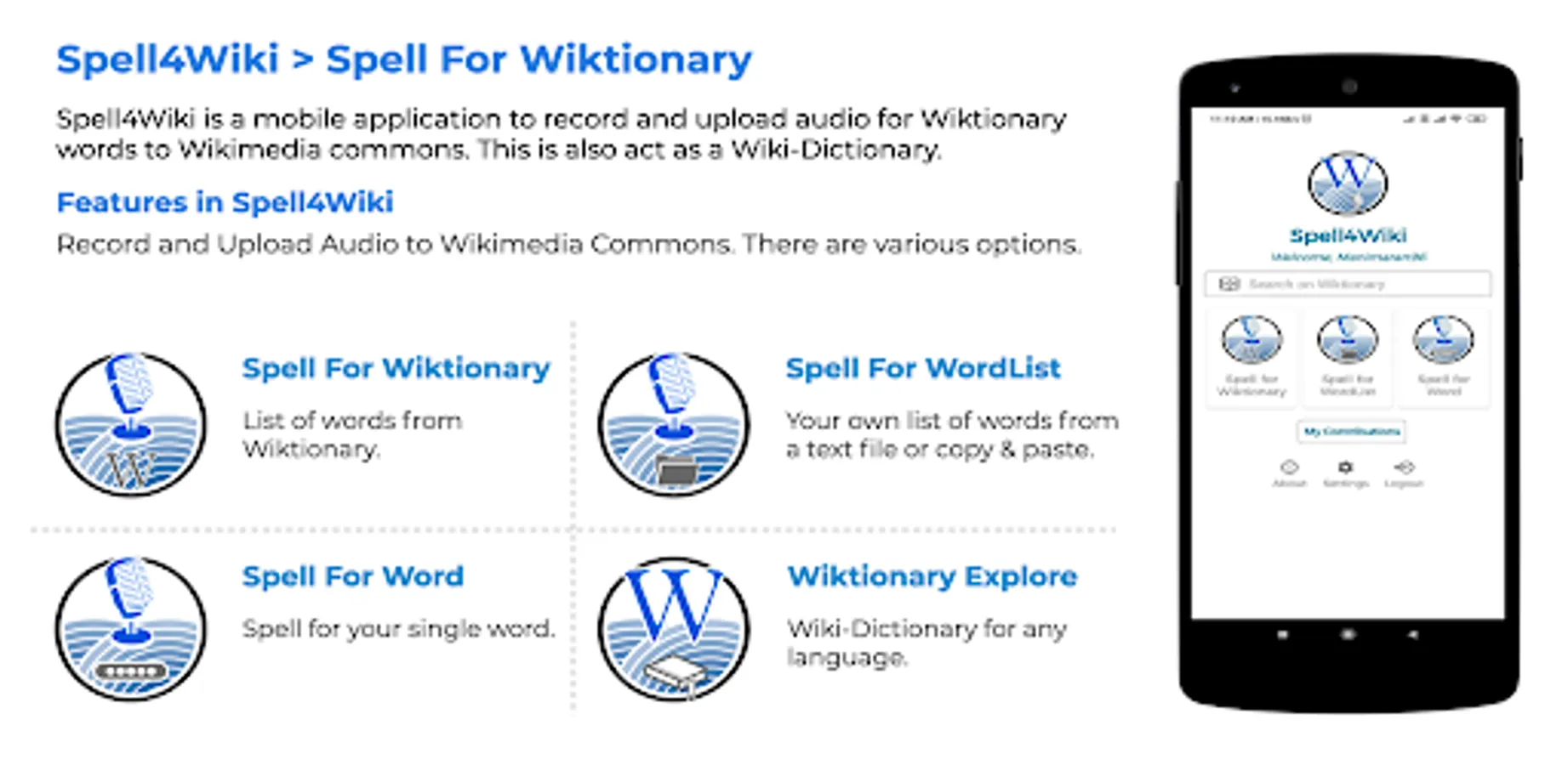 Spell4Wiki is a mobile application to record and upload audio for Wiktionary words to Wikimedia Commons.