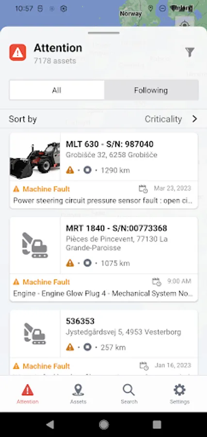 - Overview of all machines needing actions ranked by criticality level (due maintenance, errors code on eligible machines, damage reports).