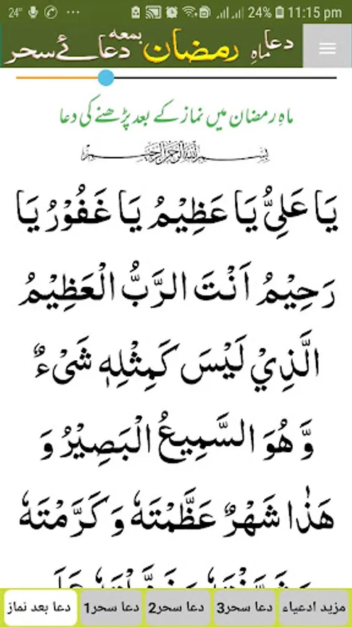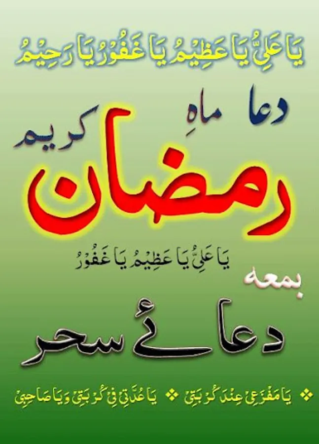 يَا عَلِيُّ يَا عَظِيْمُ يَا غَفُوْرُ يَا رَحِيْمُ اَنْتَ الرَّبُّ الْعَظِيْمُ الَّذِيْ لَيْسَ كَمِثْلِهٖ شَيْءٌ وَّ هُوَ السَّمِيعُ الْبَصِيْرُ وَ هَذٰا شَهْرٌ عَظَّمْتَهٗ وَ كَرَّمْتَهٗ وَ شَرَّفْتَهٗ وَ فَضَّلْتَهٗ عَلَى الشُّهُوْرِ وَ هُوَ الشَّهْرُ الَّذِيْ فَرَضْتَ صِيَامَهٗ عَلَيَّ وَ هُوَ شَهْرُ رَمَضَانَ الَّذِيْ اَنْزَلْتَ فِيهِ الْقُرْاٰنَ هُدًى لِّلنَّاسِ وَ بَيِّنَاتٍ مِّنَ الْهُدٰى وَ الْفُرْقَانِ وَ جَعَلْتَ فِيهِ لَيْلَةَ الْقَدْرِ وَ جَعَلْتَهَا خَيْراً مِّنْ اَلْفِ شَهْرٍ فَيَا ذَا الْمَنِّ وَ لاَ يُمَنُّ عَلَيْكَ مُنَّ عَلَيَّ بِفَكَاكِ رَقَبَتِيْ مِنَ النَّارِ فِيْمَنْ تَمُنُّ عَلَيْهِ وَاَدْخِلْنِي الْجَنَّةَ بِرَحْمَتِكَ يَا اَرْحَمَ الرَّاحِمِيْنَ