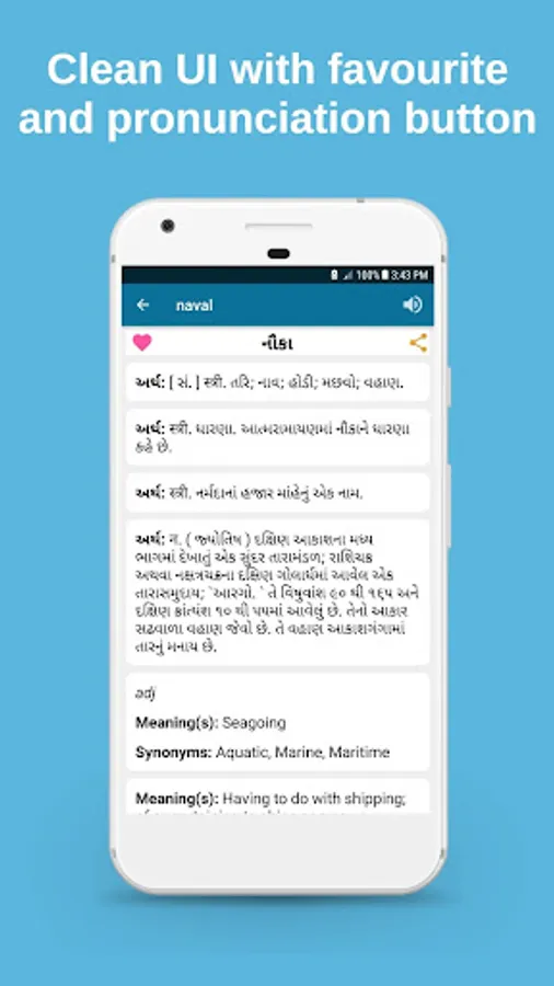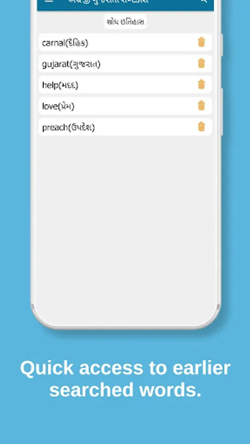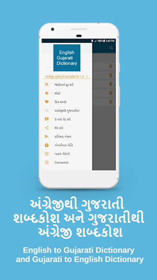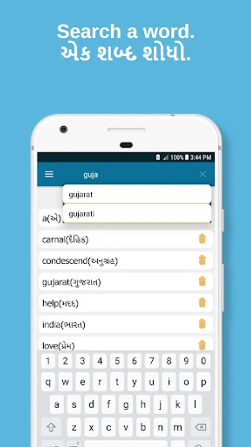 Gujarati dictionary app gives Gujarati to English and English to Gujarati meanings, synonyms, antonyms with 200000+ words.