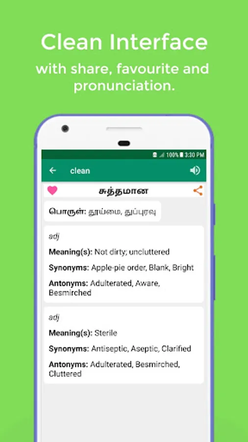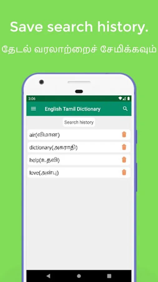 This offline English Tamil dictionary is designed to help Tamil speakers to improve their communication skill. This best Tamil dictionary free app provides you with the opportunity to search and find the translation of any word. Easy words searching system, faster and user-friendly interface.