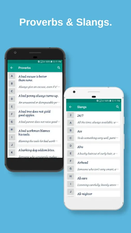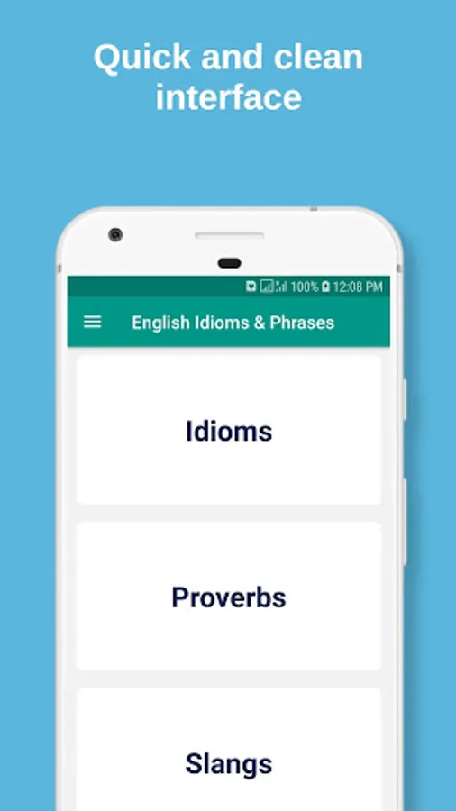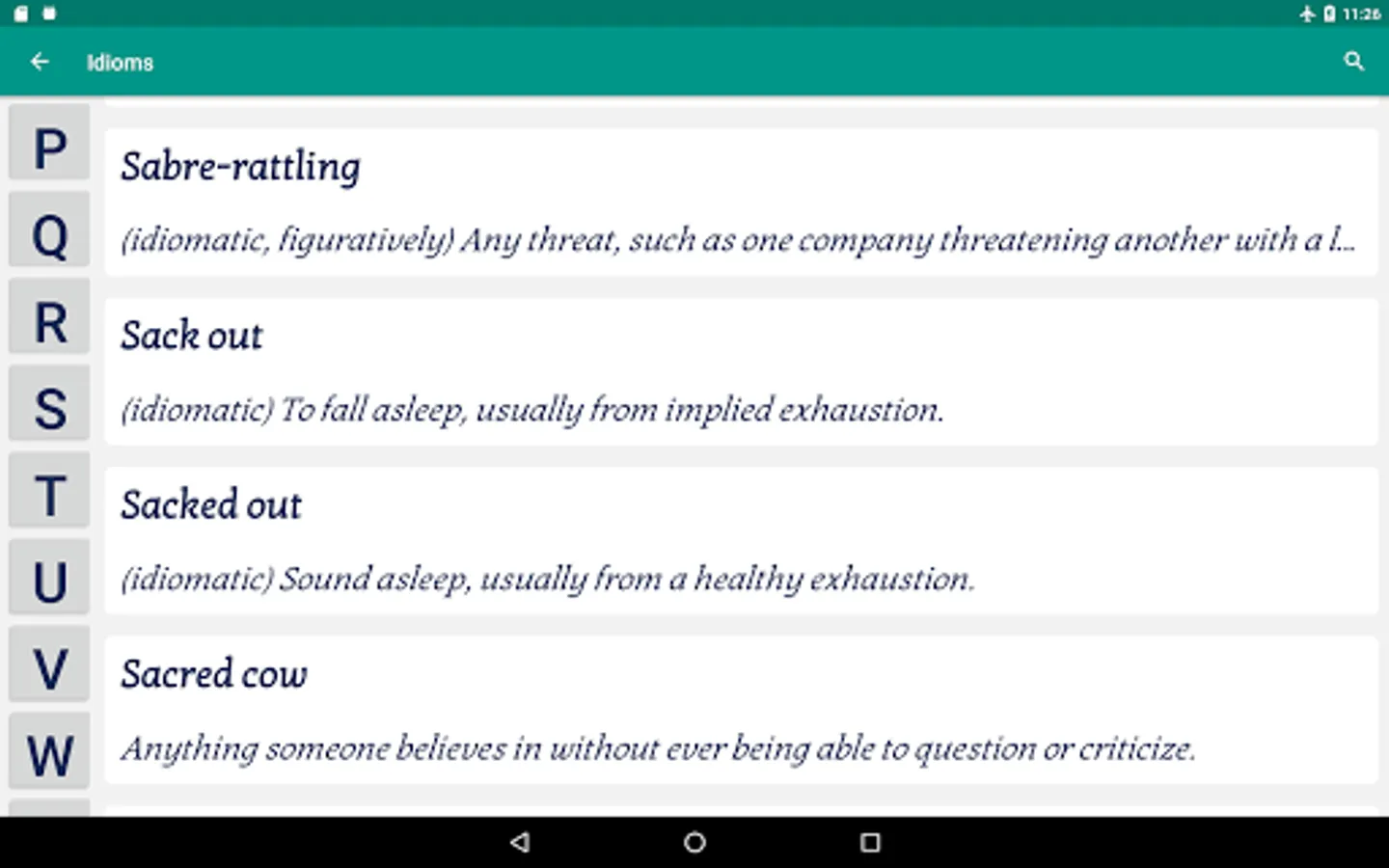 Idioms and phrases app is a very useful app for learning Idioms, Slangs, Phrases, and Proverbs in English. It has over 10000 idioms, slangs, phrases, and proverbs.