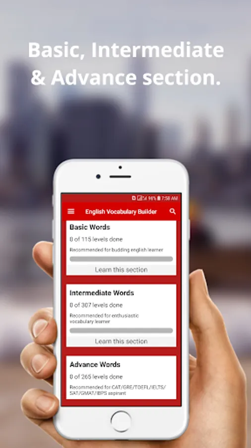 English Vocabulary Builder offline app lets you learn new English words using its interactive Flashcard Quiz format and improve your English Vocabulary every day.