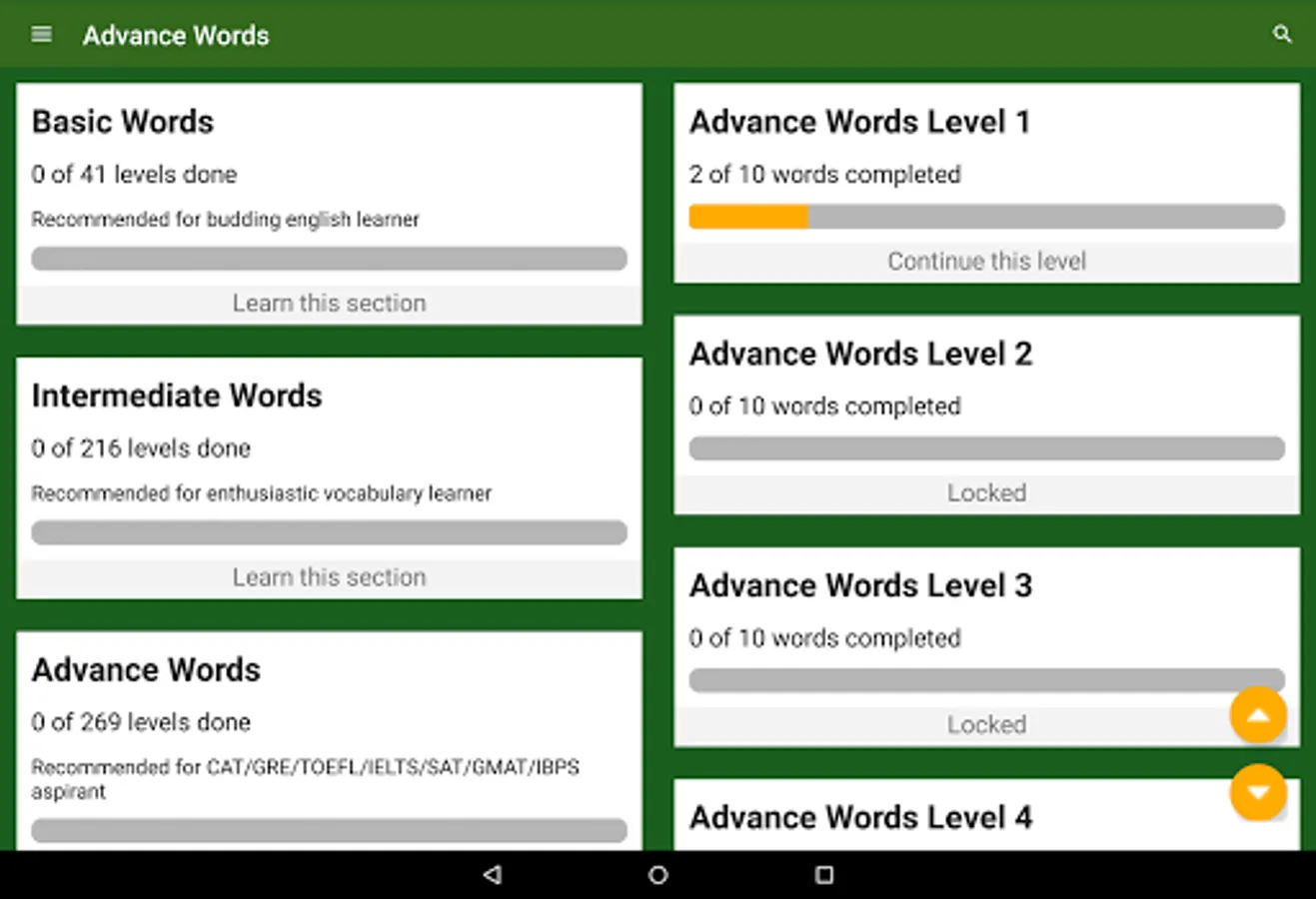 Basic, Intermediate, and Advanced words sections