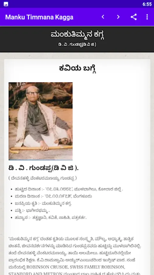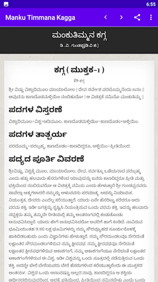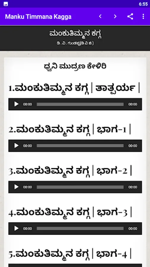 Kagga is very popular in Kannada literature, and most native Kannada speakers are familiar with at least a few of the poems from this important work. In this app, we provided links to literature and kagga songs in written and music play.