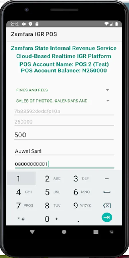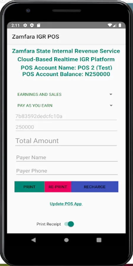Zamfara State Internal Revenue Service IGR Platform POS Android Application use to collect IGR Payment from Customized IGR Platform POS Device