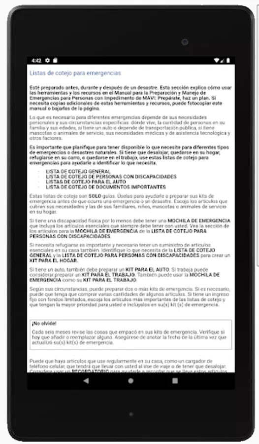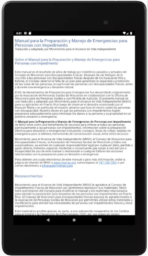 The Emergency Preparedness Toolkit was originally developed by the Wisconsin Association of Deaf People in collaboration with the Wisconsin Office for the Deaf and Hearing Loss. This manual is one translated and adapted by the Movement for the Reach of Independent Living (MAVI) for its application in Puerto Rico after observing the disaster caused by Hurricane Maria and in particular the adverse impact it had on people with disabilities . Our desire is for people with disabilities to prepare adequately to minimize damage to their person and property in an upcoming disaster or emergency.