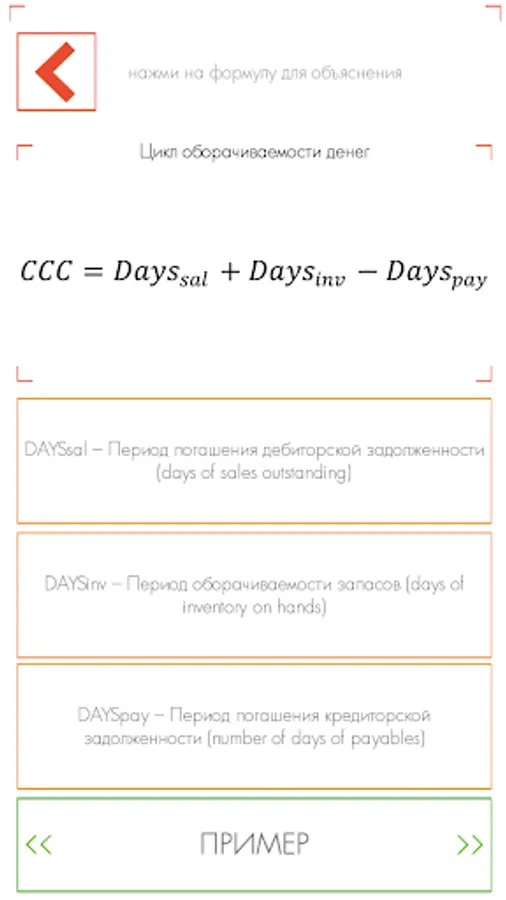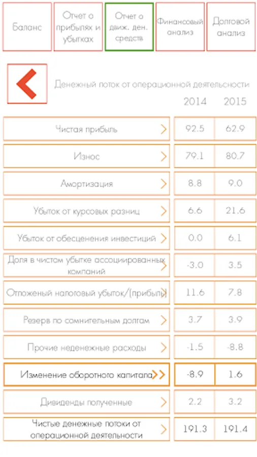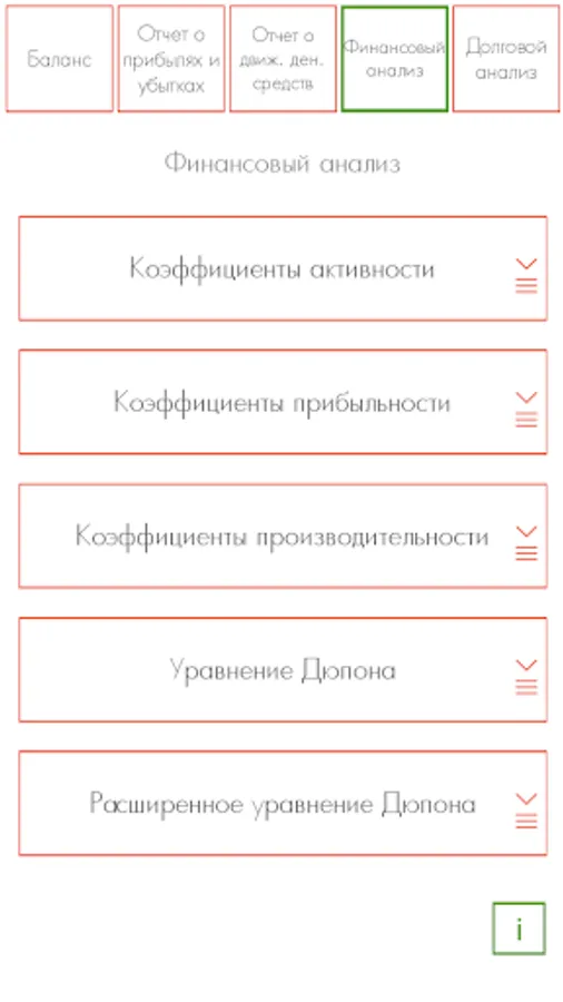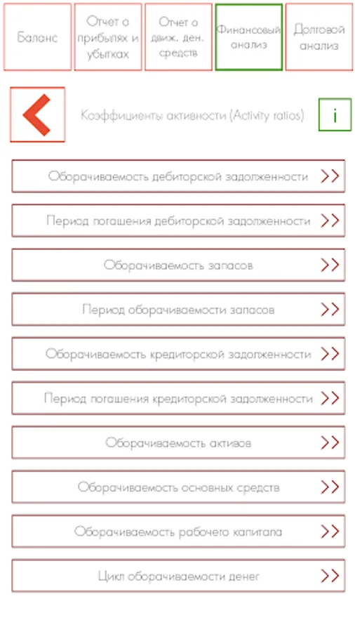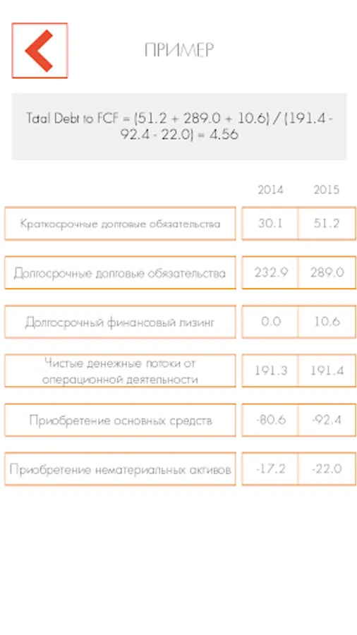 The "Financial Analysis" sections and "Debt Analysis" you will find the key formulas for analysis statements, explanations and examples of them, created on the basis of statements shown in this application.