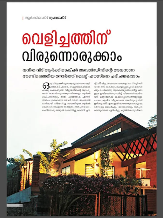Vanitha Veedu is the largest circulated Malayalam magazine in Home and interior section. It covers A-Z of house construction and interior designing. Every issue of Vanitha Veedu includes a variety of plans and ideas for your Dream Home. Many big names of architecture and related fields often appear in the pages with valuable guidance and expertise.