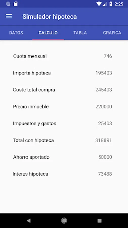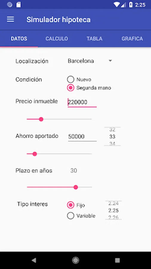 With this app you can calculate the monthly amount that your mortgage will cost you based on the savings provided, the term in years to repay the money and the price of the property. It also calculates the property transfer tax based on the autonomous community of the city you select and takes into account whether the property is new or second-hand.