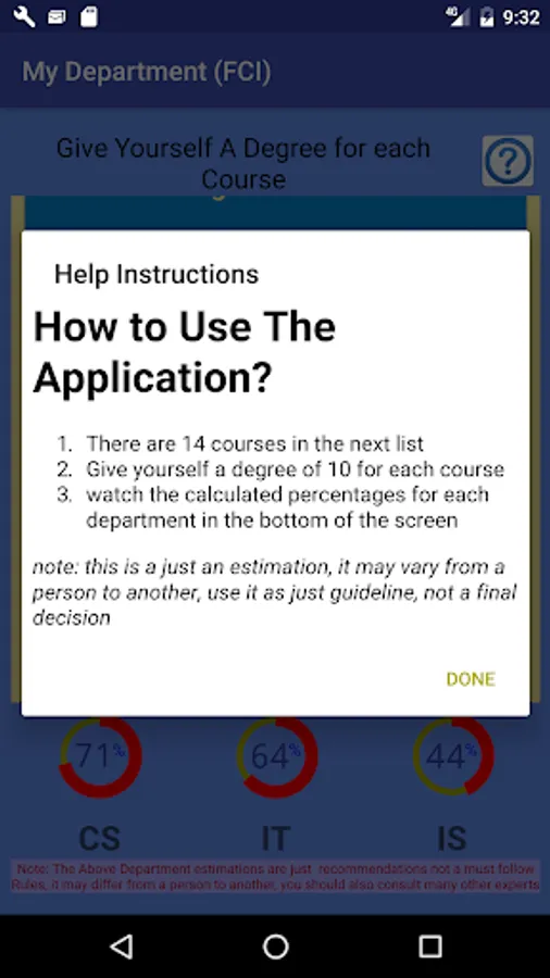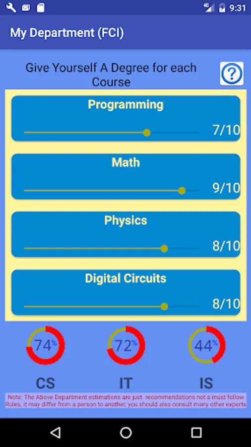 This is an Unofficial application for the 2nd year students of Faculty of Computer and Information Systems in Mansoura University, to help them to choose the suitable department for them from (computer science, information technology, information systems) departments in the third year. This is based on the studied courses/topics on 1st and 2nd years.