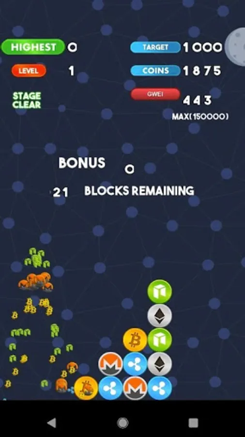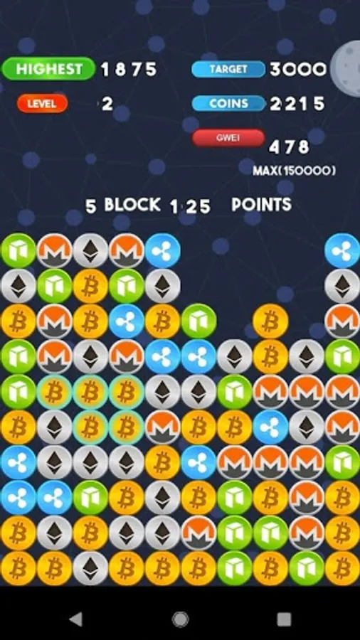 The more coins you manage to group together, the more points you get. You will earn "Pump It", "Lambo" and "To the Moon" badges depending on how many coins you blast.