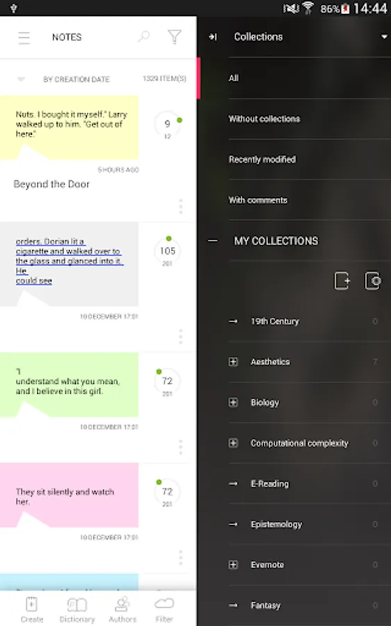 - Retrieve the saved definitions and the notes taken in all your books in the notebook, organize them as in the bookshelves