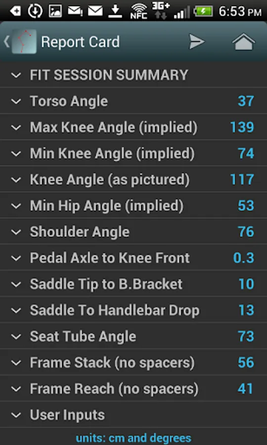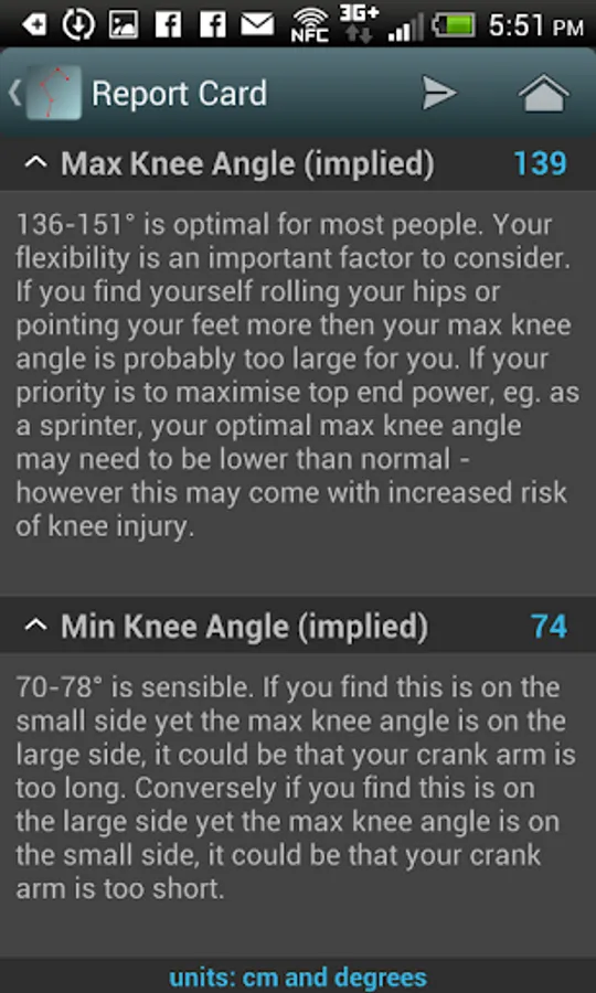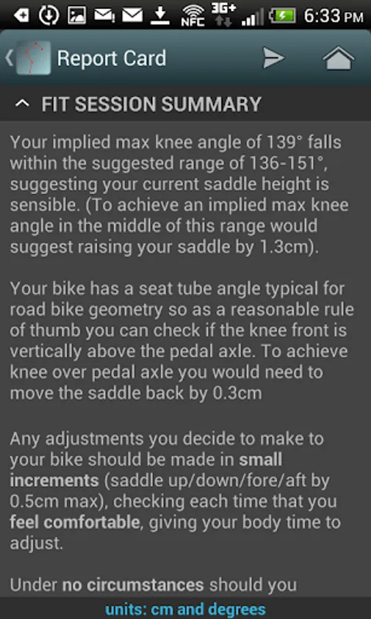 Receive a bespoke Report Card detailing twelve statistics (see screenshot). Suggestions for adjusting your bike are made with reference to target ranges for the most important fit parameters. Share your bike fit results with others via email (pictures included).