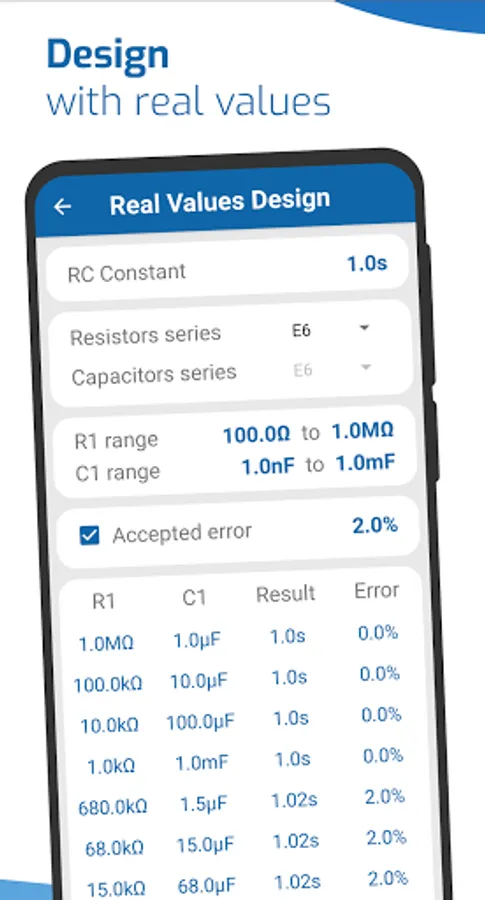Let the app compute the values of the components you need in order to obtain your desired result from the circuit. The tool also includes the possibilities to use and compute only standard value resistors, to have your circuit ready for practical implementation.