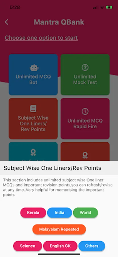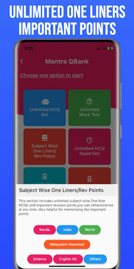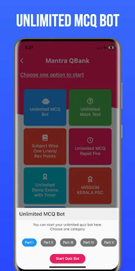 Are you preparing for Kerala PSC Exams, dreaming to get a government job ? Try learning from the best ,largest and most affordable interactive question bank with unlimited features including Unlimited MCQs BOT,Unlimited mock tests,Unlimited demo tests with timer and negative marks,Rapid fire tests.Subject wise one liners, important points, repeated questions and English Malayalam GK are also included.