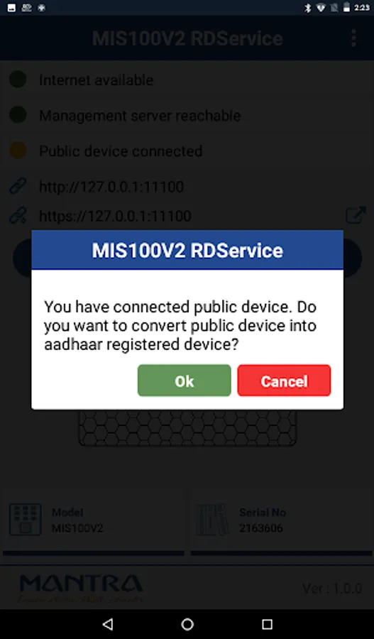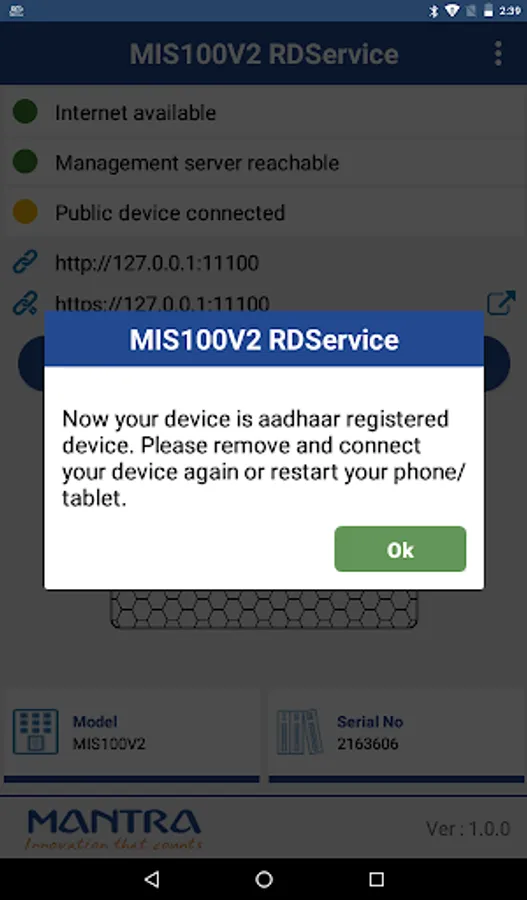MIS100V2 RD (Registered Device) Service enable the biometric based aadhaar authentication with registered device concept implemented by UIDAI.