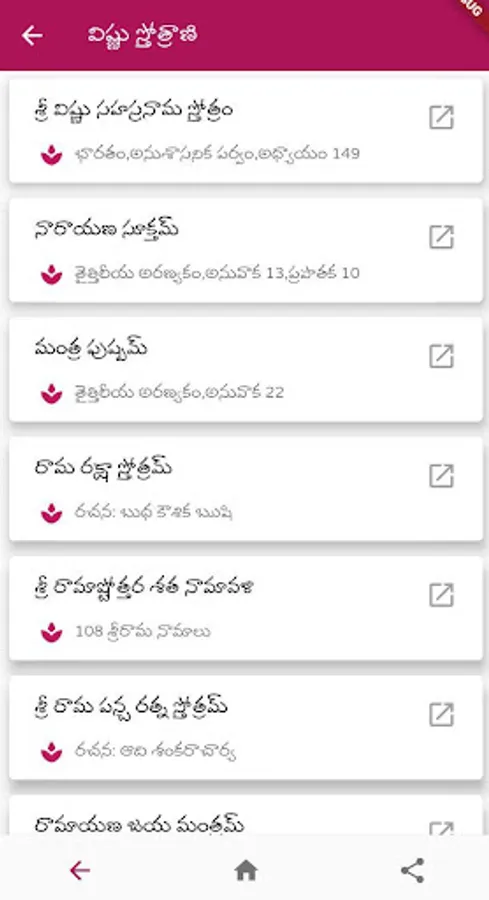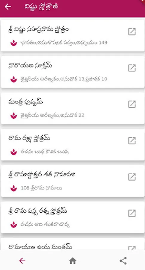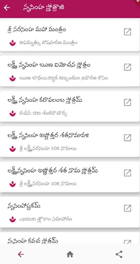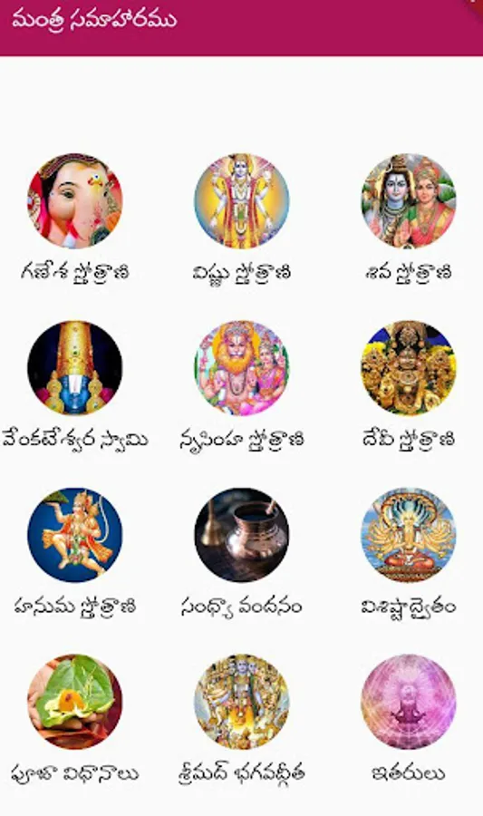Mantra Samahara app has mantras, stotras,pooja vidhanalu in Telugu organized into 12 categories.This App contains Nitya Parayana Slokas and Mantras of different gods like Ganesha, Shiva,Vishnu, Rama, Krishna, Hanuman,Lakshmi, Parvathi, Saraswathi,Durga,Venkateshwara Swamy, Narasimha Swamy, Vishistadvaitha ,Sandhyavandhanam,Bhagavad gita and other Nitya Parayana Slokas and Mantras.