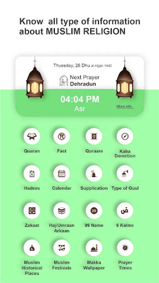 - Muslim Holiday and Festivals : The app will provide you complete list of all Islamic Holidays and Festivals. It will remind these days well in advance.