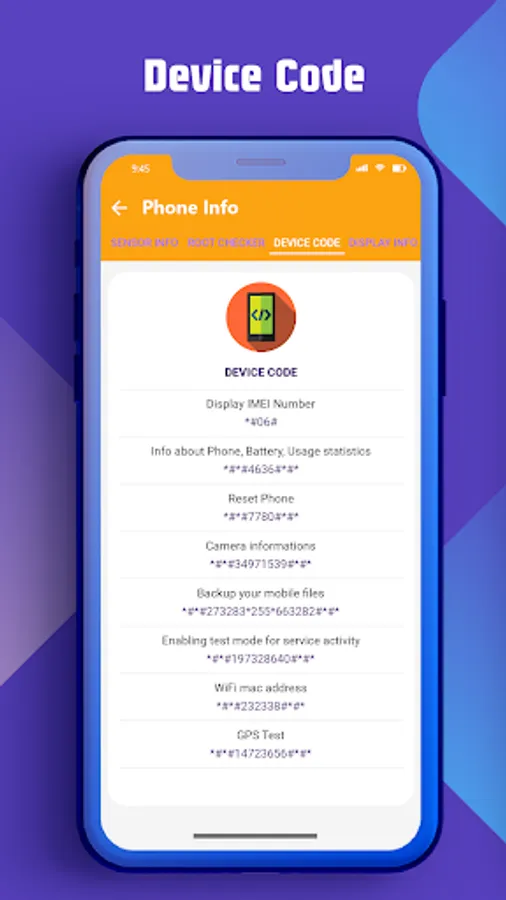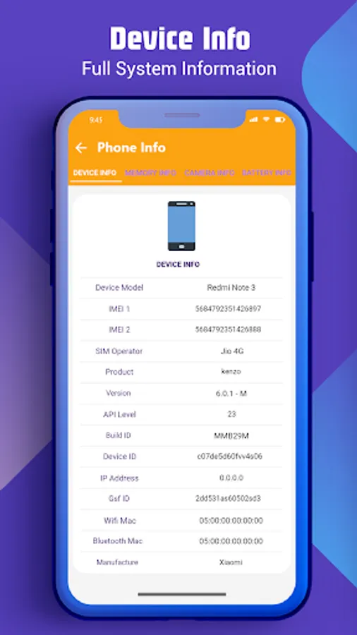 - IMEI 1, IMEI 2, SIM operator, Product, Version, API Level, Build ID, Fingerprint etc.