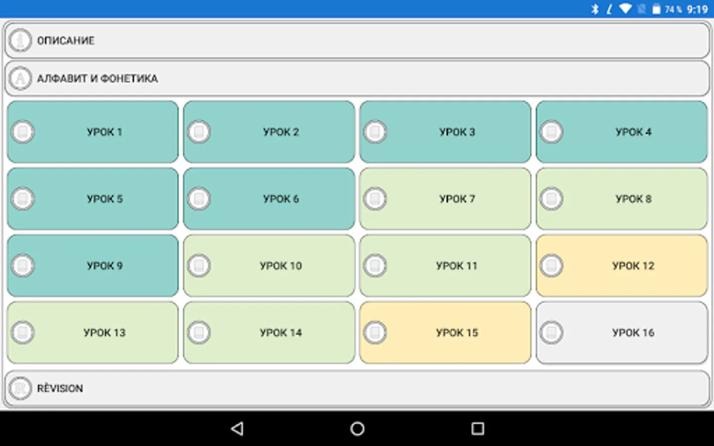 The application includes the first 16 lessons and exercises to test residual knowledge.