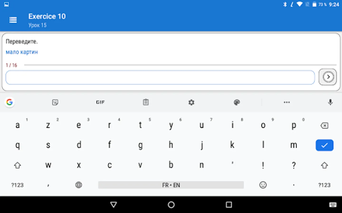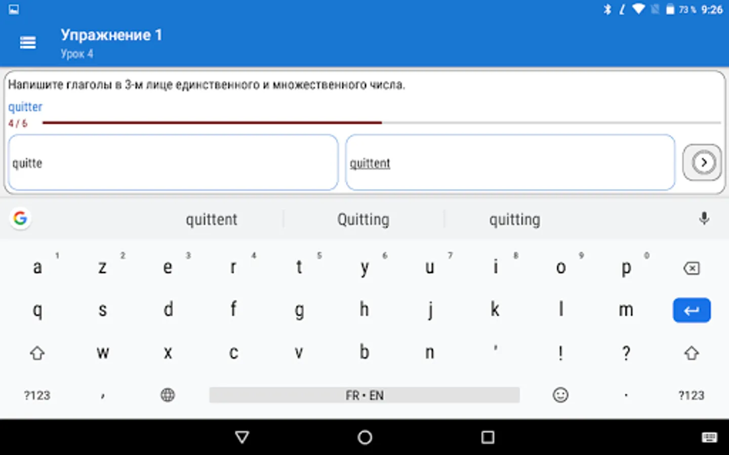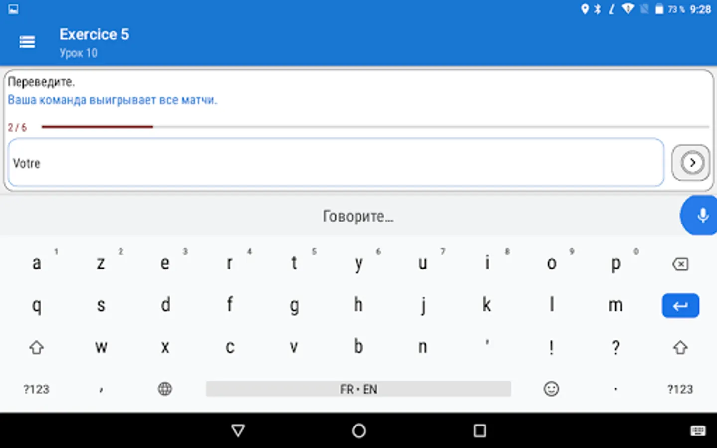 It is recommended to activate the French keyboard for the convenience of typing answers, especially when you need to write special French characters. To enter answers, you can use Google voice input. To do this, in the system settings of your device, you need to add support for French. This will allow not only to enter answers verbally, but also to train in the pronunciation of words and sentences in French. But it is preferable to combine the input of answers on the keyboard and voice for writing and verbal skills.