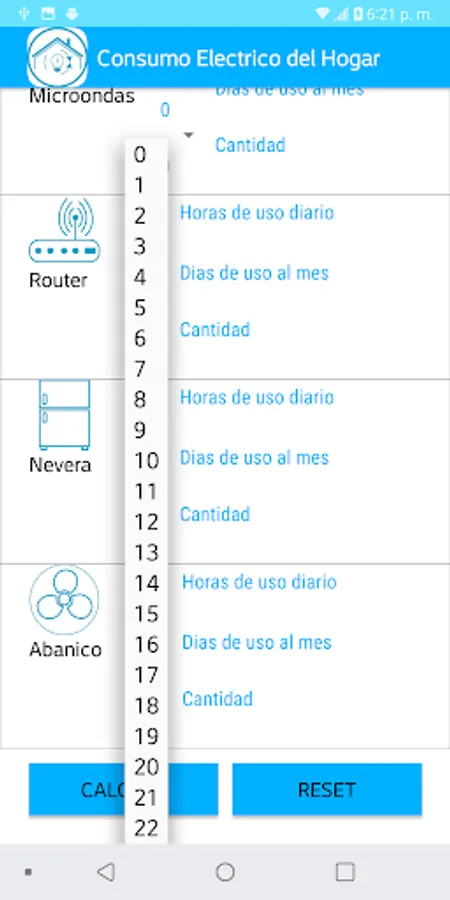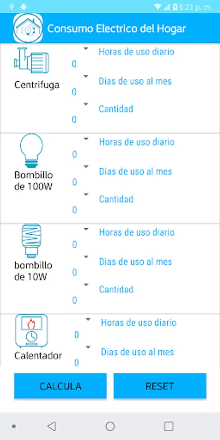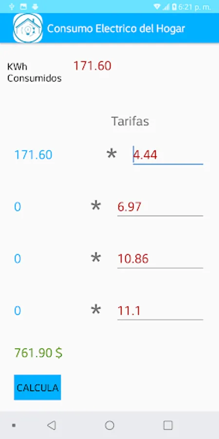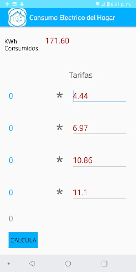 This application was created in order to offer you an approximate of the household electricity consumption, through a few simple steps, for those who doubt the electricity meters of the electric companies comes "Household Electric Consumption". Just enter the approximate daily use, days of use per month and the number of appliances, then send them to another tab where they will place the price per kilo-watt hours of your country and get their results.