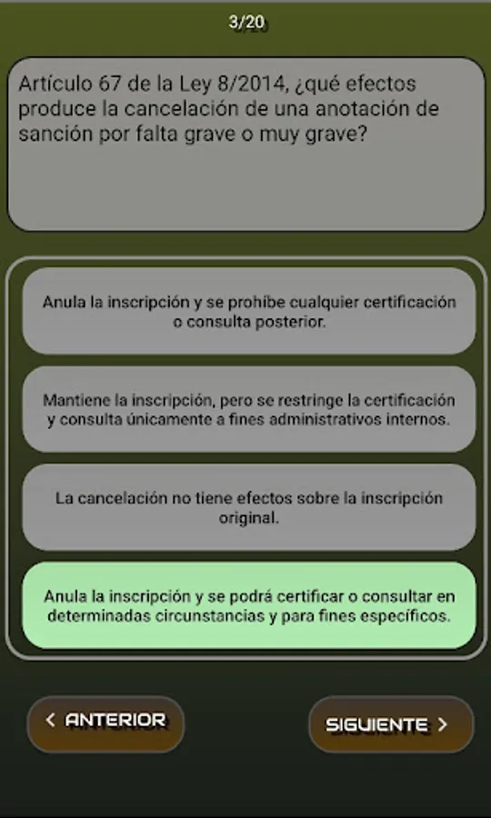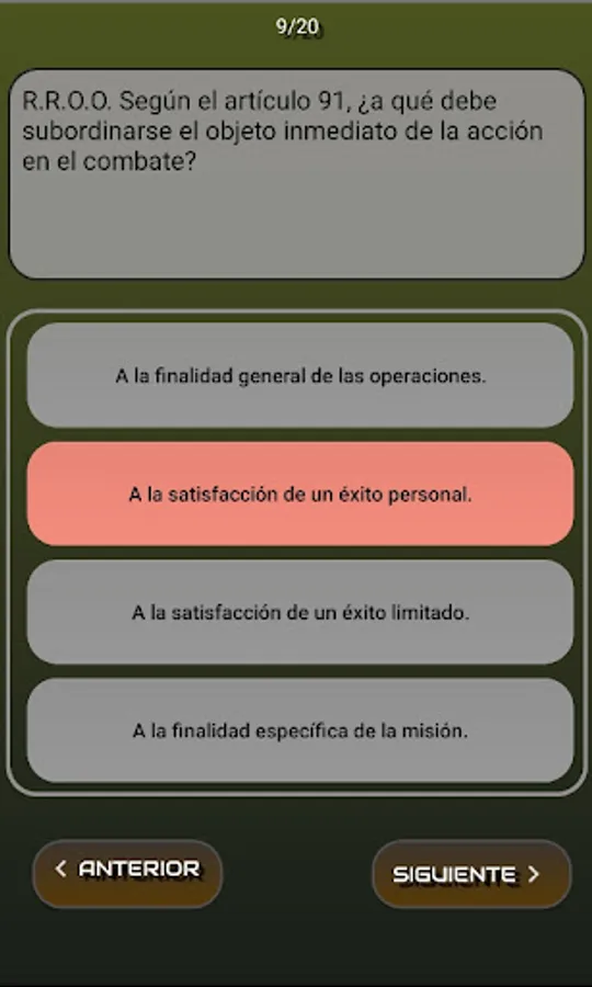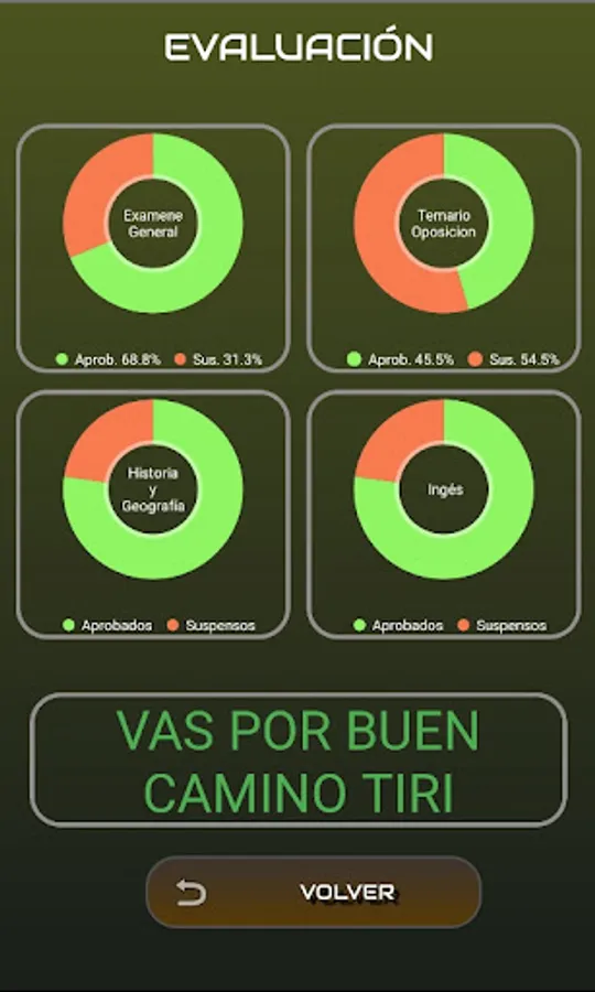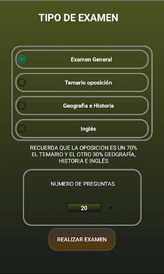 This application is designed as a tool to support the preparation for the 1st Corporal of the Army exam. You can take opposition exams of 20, 25, 30 or 50 questions, you can take exams of 20 questions by blocks (Syllabus, Geography and History, or English). You can also take exams with failed questions.
