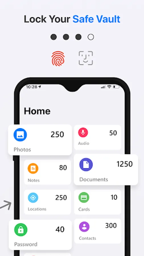SafeDoc is a safe place to keep photos, videos, documents, passwords, cards, notes, contacts, audios (voice notes), favourite locations, and banking cards.