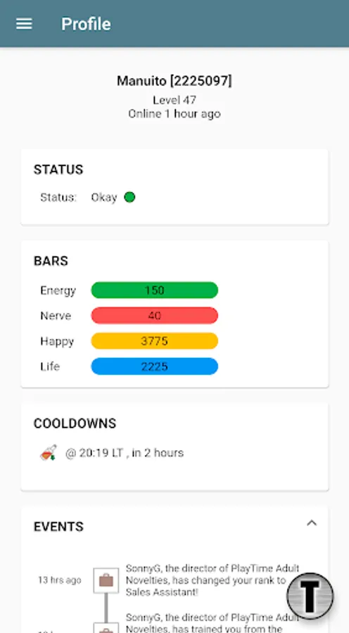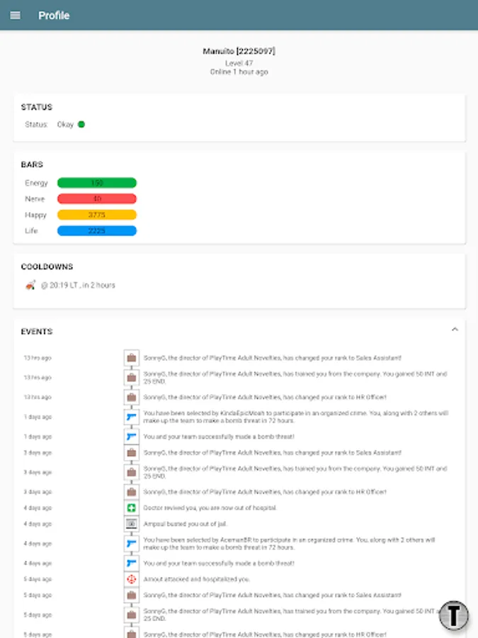 * Profile page with shortcuts to you preferred sections, access to basic status data, recent events, cooldowns and net-worth calculation. You can also manually activate notifications so that you don't waste any energy, nerve, or miss any cooldown expiry.