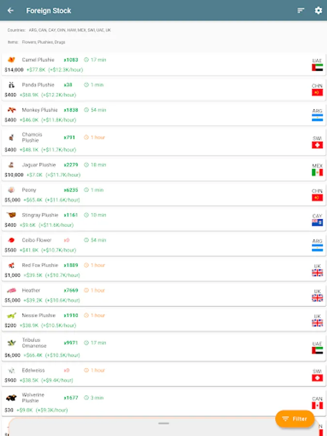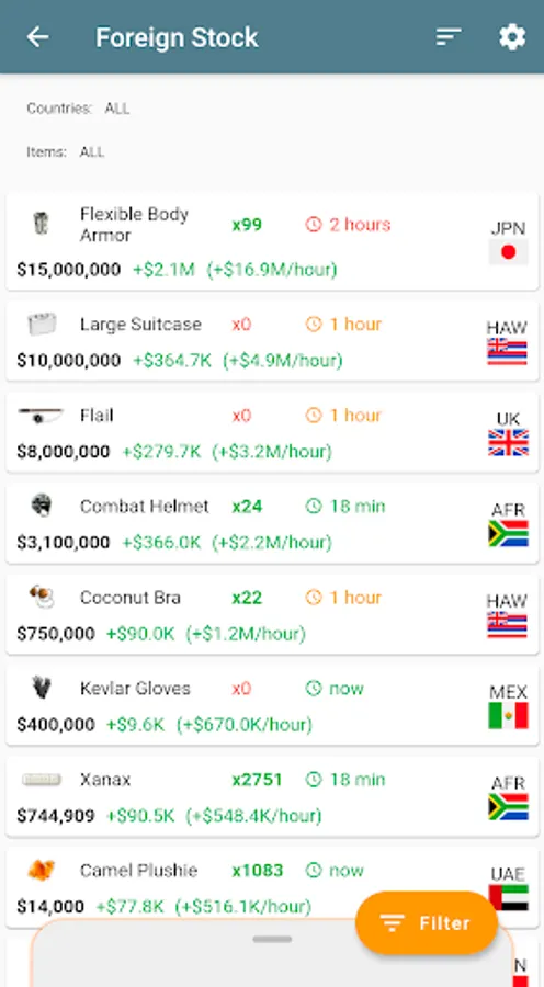 * Have a look at foreign stocks directly in the Travel section. Filter and sort items at your convenience, including profit based on item capacity. Also, by using the in-app browser, you are contributing by sending stock data automatically to the shared database!