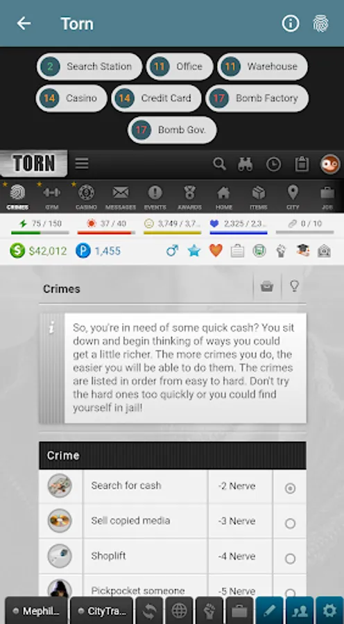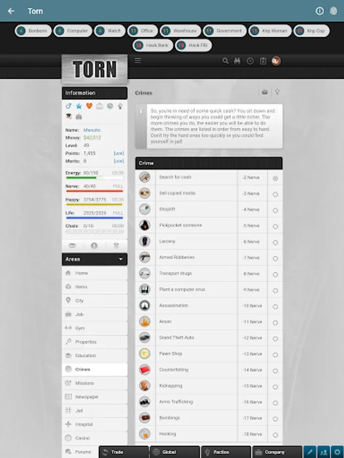 * Quick crimes option when you visit the crimes section. Just set up your preferred crimes and they'll appear in the top bar.