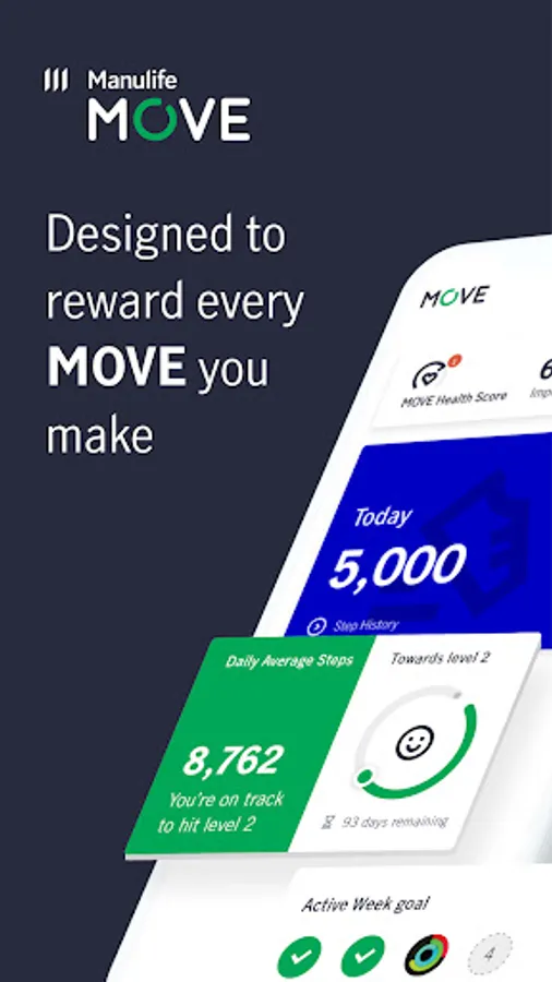 The ManulifeMOVE app promotes a healthy lifestyle by enabling members to track their progress against set fitness goals. Earn more by signing up now!