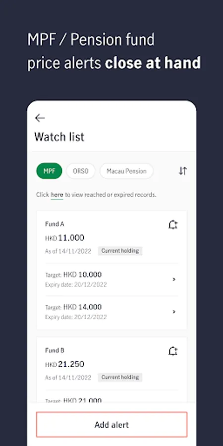 • Set MPF / Pension fund price alerts, switch funds and change investment instructions