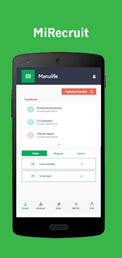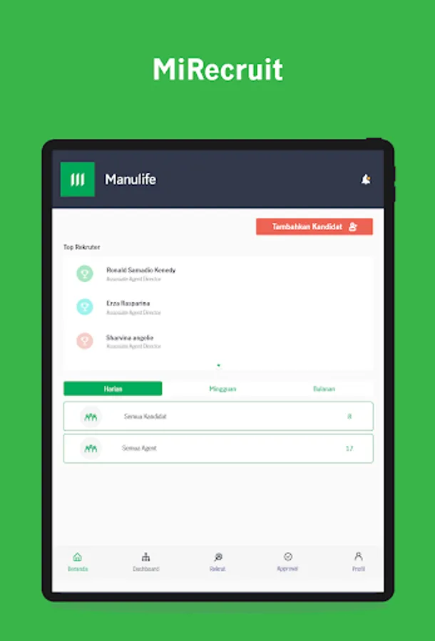 MiRecruit is a mobile application that allows Manulife agents to recruit potential agents anywhere and anytime. Agents can also monitor the recruitment process of prospective agents and see their own recruitment performance.