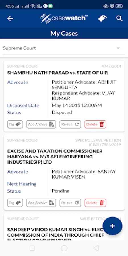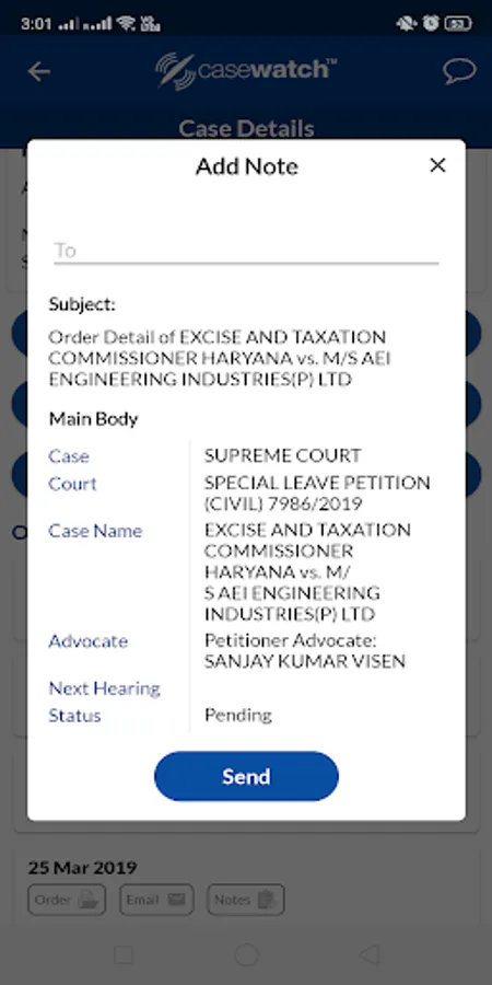 CaseWatch allows user to add their running cases, and get alerts regarding the orders and next hearing date etc.