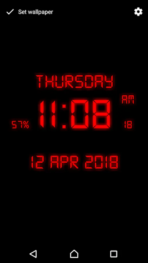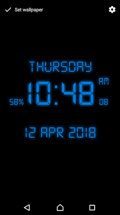 Live Wallpaper that displays current time, date and battery charge parentage . All date formats are supported.