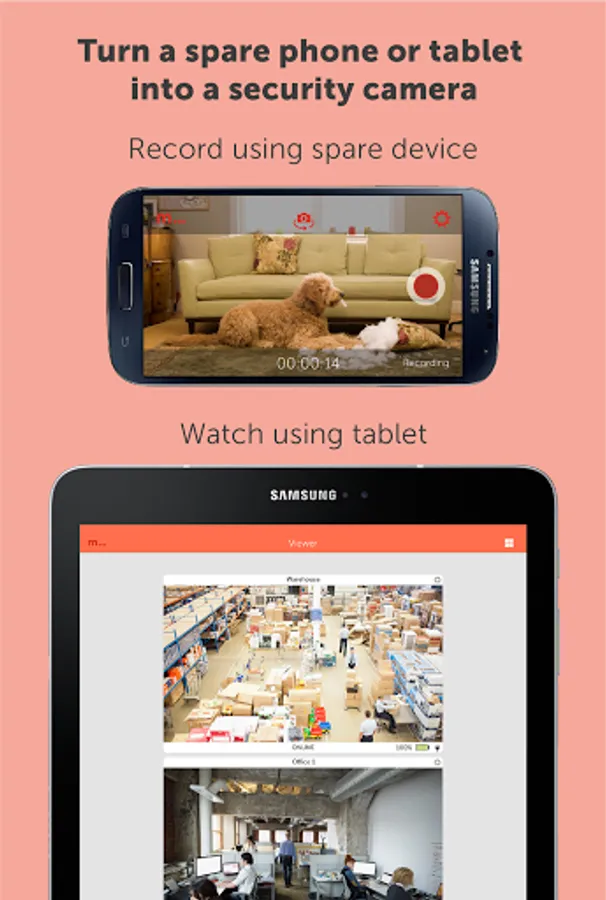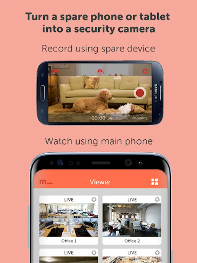 Simply install Manything on your spare device, select "Camera" mode and press record. Then download Manything to your main phone or tablet which you carry with you and select "Viewer". It's that simple, now you can watch your camera from anywhere!