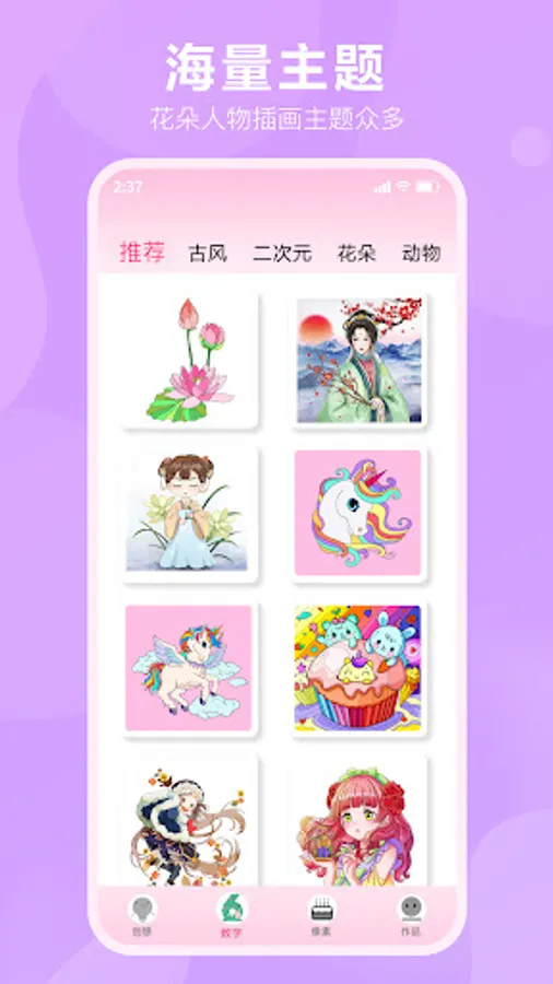 So many subjects like characters, ancient customs, animals, flowers, works of art, scenery. The App is simple and easy to use. Just click the color block corresponding to the color number in the picture with your finger, and you can fill in the color with one click. You can enjoy the fun of digital coloring anytime and anywhere without paper and pen.