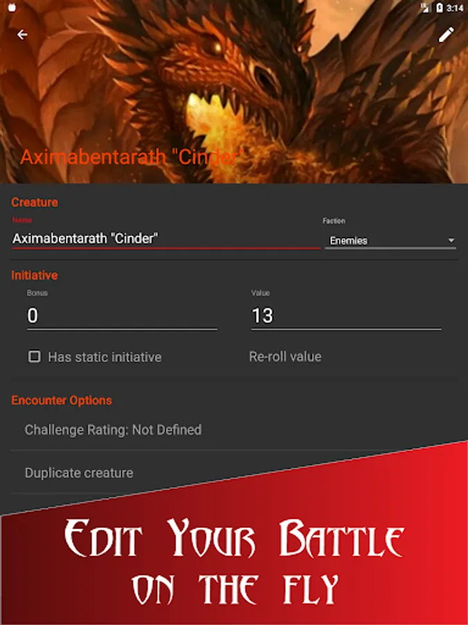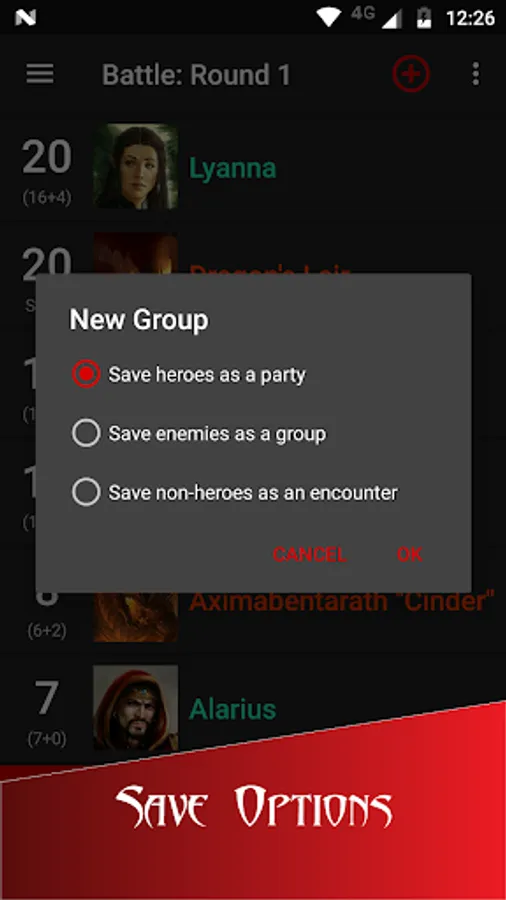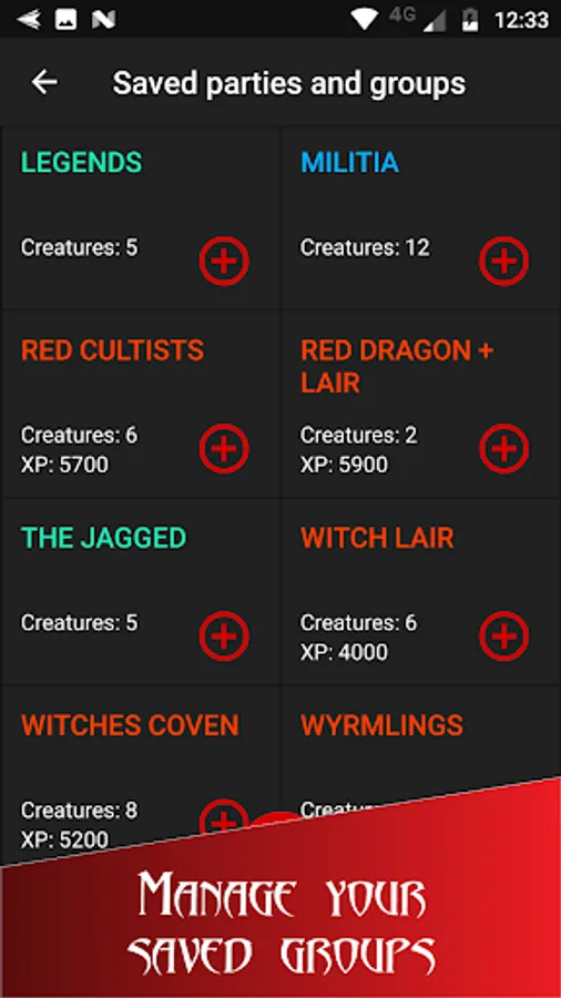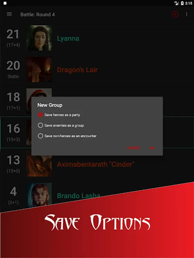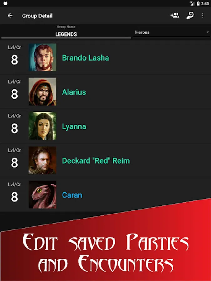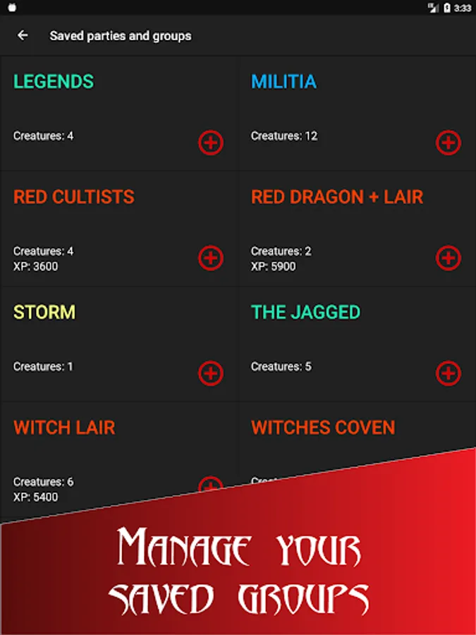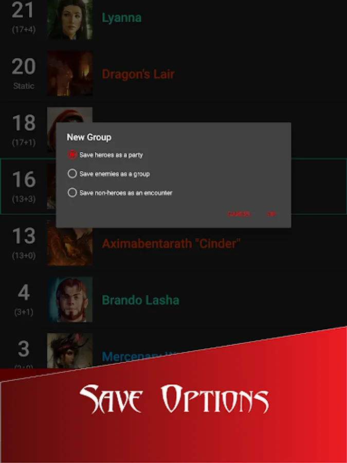 - Create saved groups and encounters from current battle or from scratch to track your campaign