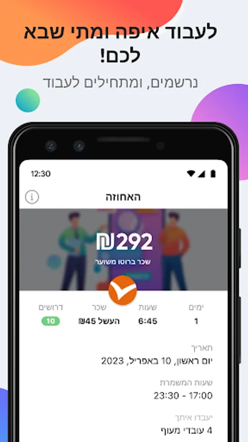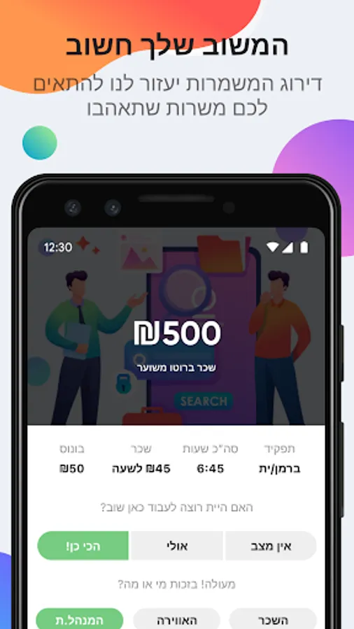 In the Getjob app you are in the center of things. All the information relevant to the job, to the job interview and the forms you will need to fill out are accessible to you in the application, transparent and clear. You can also get an answer to any question you may have at any stage!