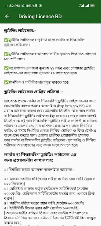 Everyone must have a driving license to drive a motor vehicle in a public place. One needs to hold a learner driving license before appearing for the driving test to get a driving license. Application for learner's license should be submitted to the licensing authority in the prescribed form along with the relevant documents and fee. An applicant not a foreign national must be able to read and write Bengali or English. The successful candidate of the driving test has to submit the application along with the relevant documents and fee to the licensing authority in the prescribed form.